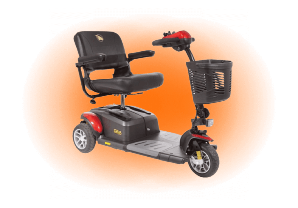 A lightweight, portable 3-wheel scooter. Heaviest component is just 32.5 lbs. Weight capacity of 300 lbs, range up to 12 miles per charge, and top speed of 4-4.5 mph. Ideal for guests who need a compact, transportable scooter.