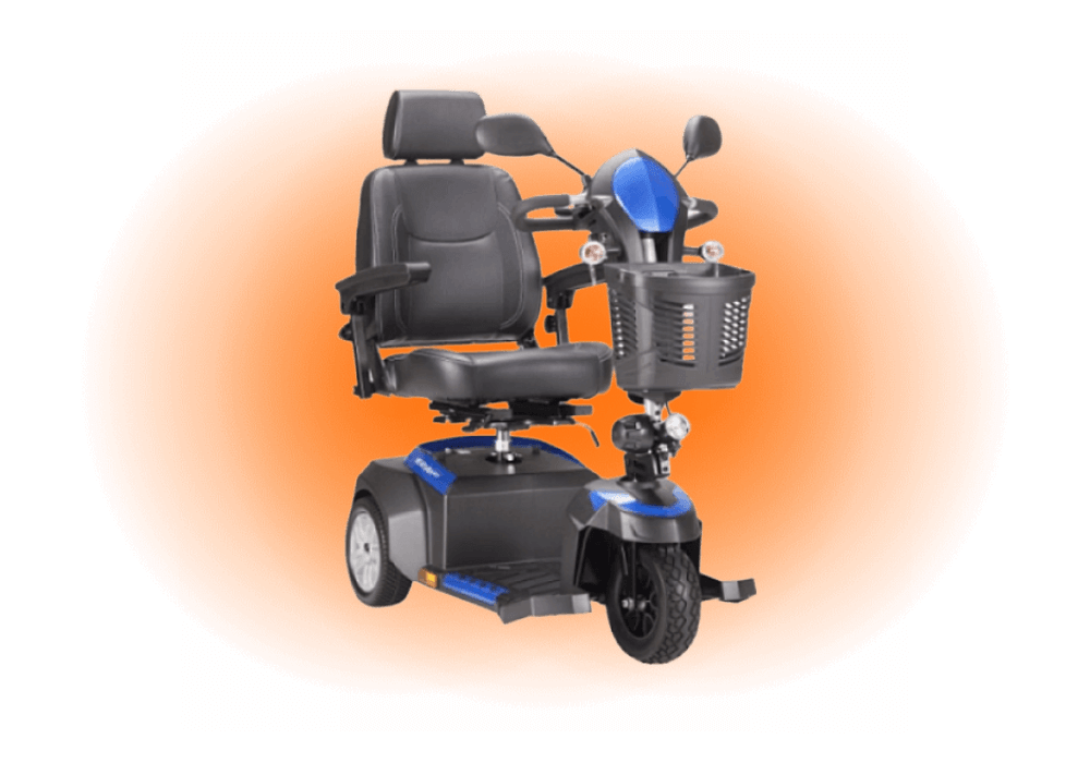 Full-size 3-wheel scooter with tight turning radius. Weight capacity: 400 lbs. Range up to 19 miles.